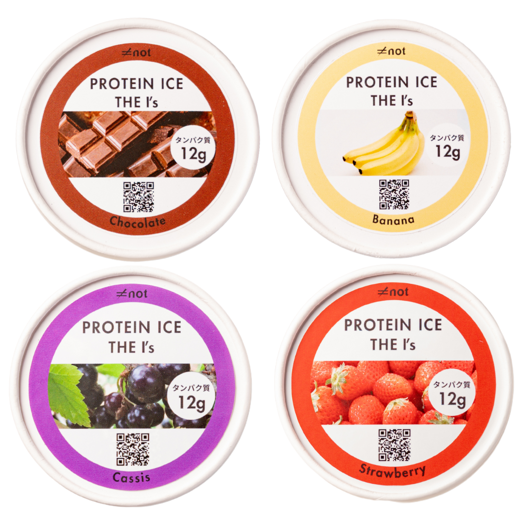 プロテインアイスTHE I’sの味のラインナップは4種類。チョコレート、バナナ、カシス、ストロベリー。