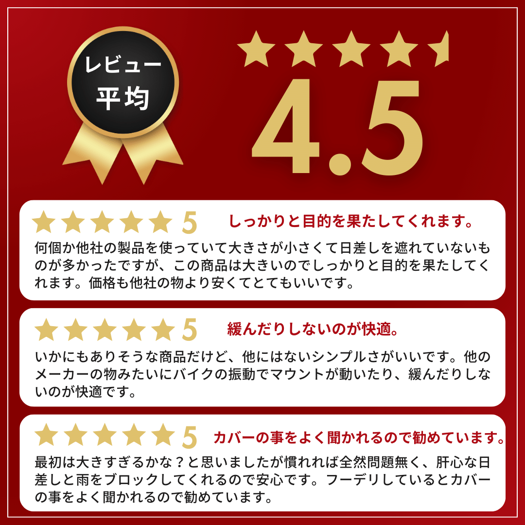 フードデリバリー歴3年です。スマホホルダー用カバーを色々試していましたがちゃんとカバーされなかったり、いちいちカバーを開閉しなければならなかったりとどれもしっくりきていませんでした。こちらの商品は今まで使用したスマホホルダーカバーで一番大きいと思いますが日差しも雨もしっかり防いでくれて満足しています。最初は大きすぎるかな?と思いましたが慣れれば全然問題無く、肝心な日差しと雨をブロックしてくれるので安心です。フーデリしているとカバーの事をよく聞かれるので勧めています。